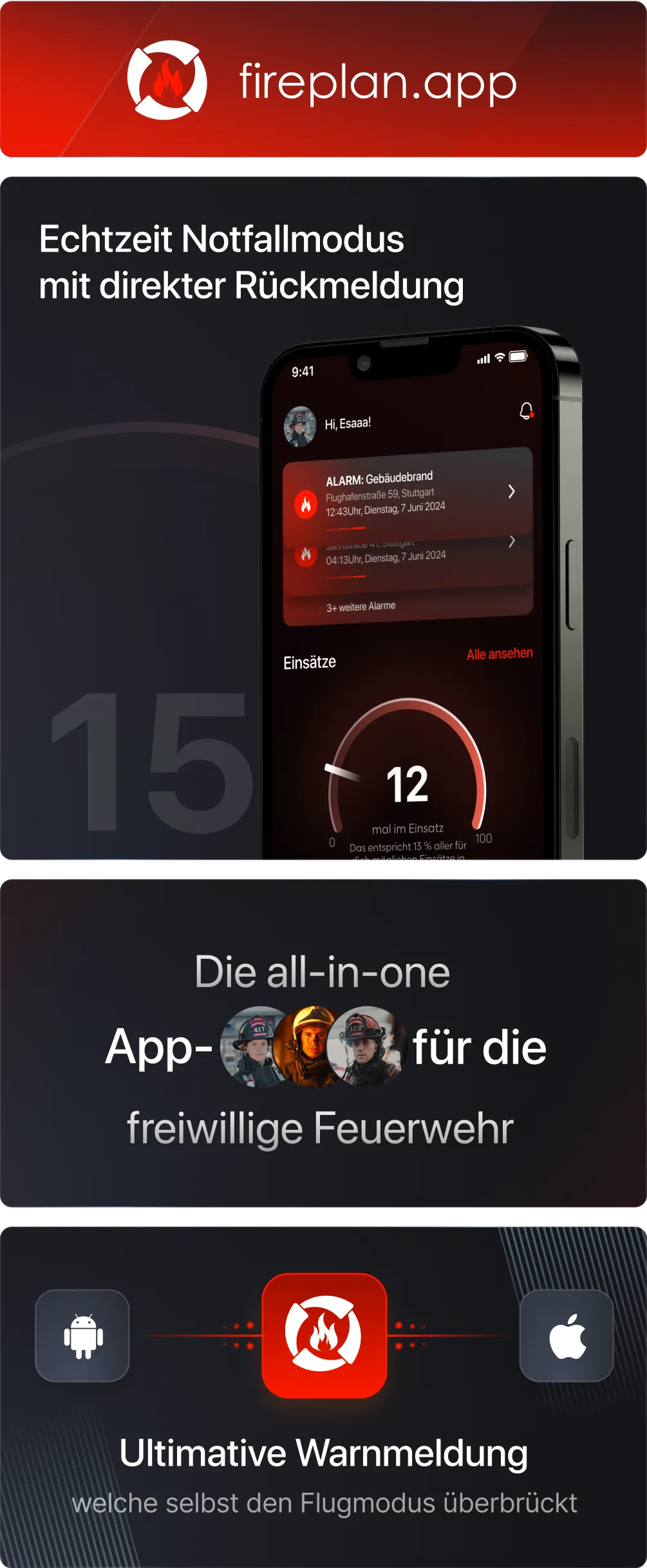 Die Fireplan-App wurde entwickelt, um Einsätze effizient zu koordinieren, Alarmierungen zuverlässig zu übermitteln und eine strukturierte Kommunikation innerhalb der Feuerwehrteams zu ermöglichen. Durch eine intuitive Benutzeroberfläche und ein leistungsstarkes Backend sorgt Fireplan für reibungslose Abläufe im Ernstfall.