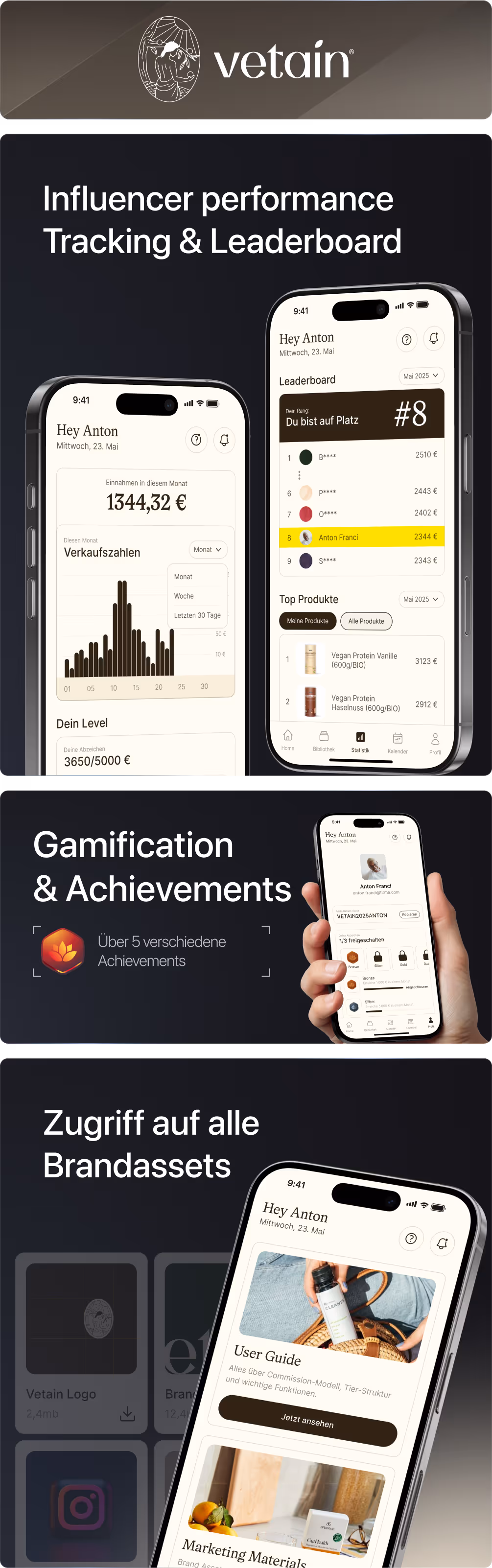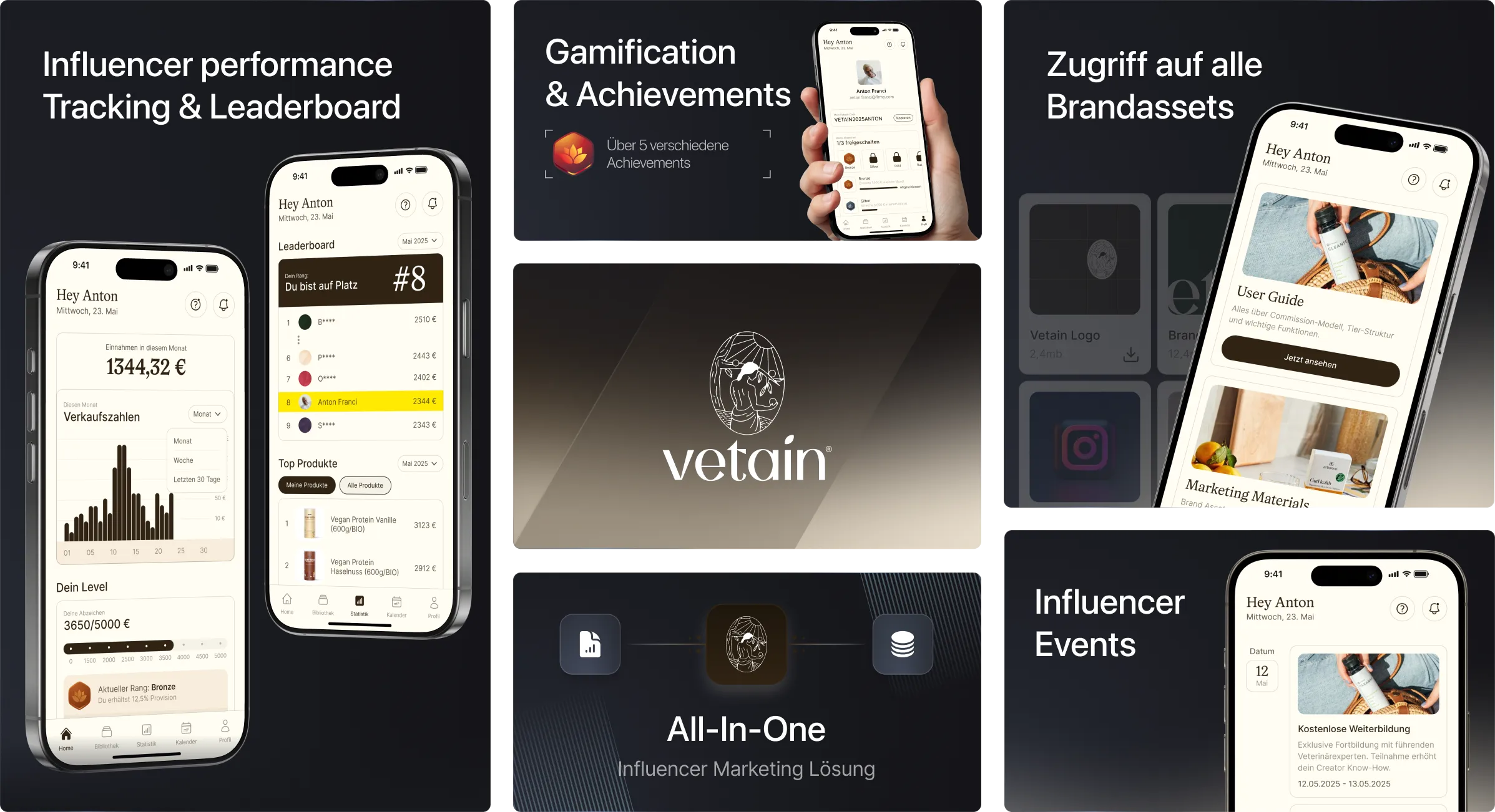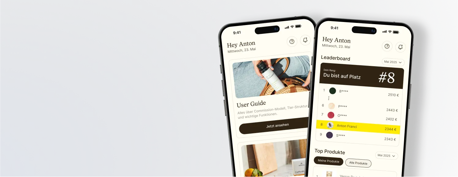 Die Vetain App wurde als native iOS- und Android-Anwendung entwickelt, mit einem Fokus auf Performance-Tracking, Creator-Motivation und effizientem Admin-Handling. Creators sehen direkt beim Start ihre aktuellen Umsätze, Level-Fortschritte, Top-Produkte und anstehende Kampagnen. Das integrierte Rang-System zeigt visuell, wie nah sie dem nächsten Bonuslevel sind – inklusive Achievement-Badges und Push-Erinnerungen bei Zielverfehlung.